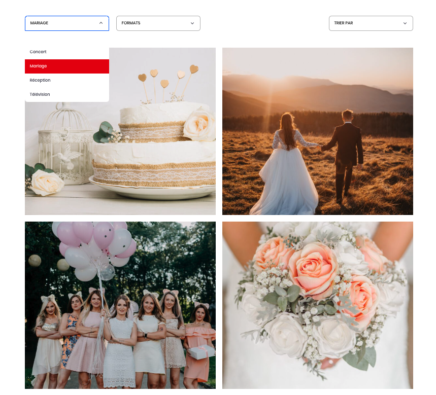 - filtres et tri dynamiques selon les catégories et formats,